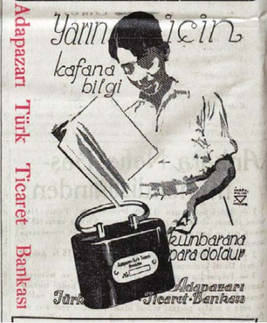 “Adapazarı Türk Ticaret Bankası tasarruf mükâfatı Banka idaresi yılbaşı gecesi kumbara alanlar arasında kura kaidesiyle, kazananlardan 16’sına nakdi ve bir kısmına da küçük hediyeler olmak üzere tasarruf mükâfatı verecektir. Çocuklarınızı tasarrufa teşvik ve yılbaşı talihinizi tecrübe etmek için 15.12.930’a kadar Bankadan kumbara almayı unutmayınız.”